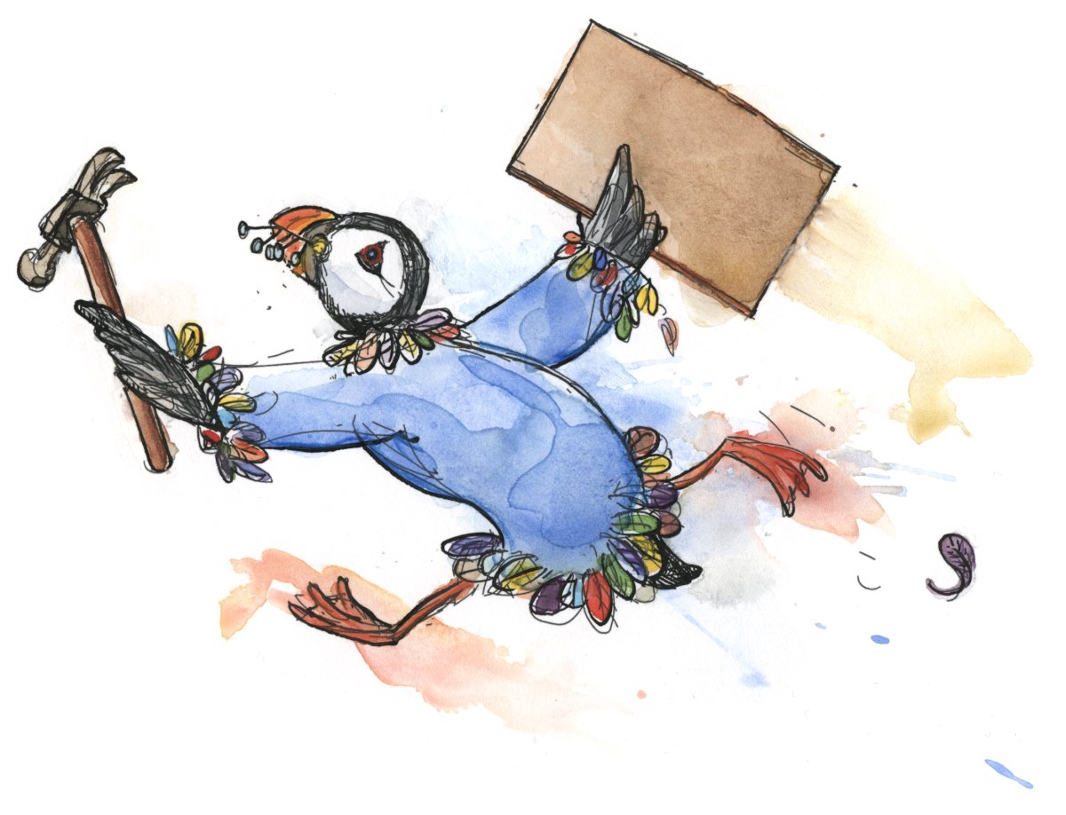 . ‘Juist,’ roept Patricia, ‘zeg maar waar ik hout en spijkers kan vinden.’ En met ijzige kalmte rent Patricia even later heen en weer met hamer en spijkers. Het lijkt alsof ze totaal geen last meer heeft van haar gekwetste vleugel. Met machtige slagen timmert oom Fedde een stuk hout voor het gebroken raam.